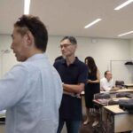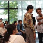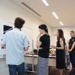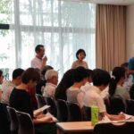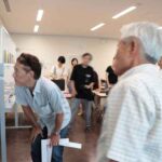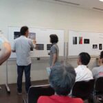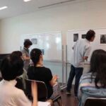 続いて、講評の時間です。今回から机にプリントを並べて周りを皆で囲むスタイルから、ホワイトボードに貼って、座りながら見られるスタイルに変更。